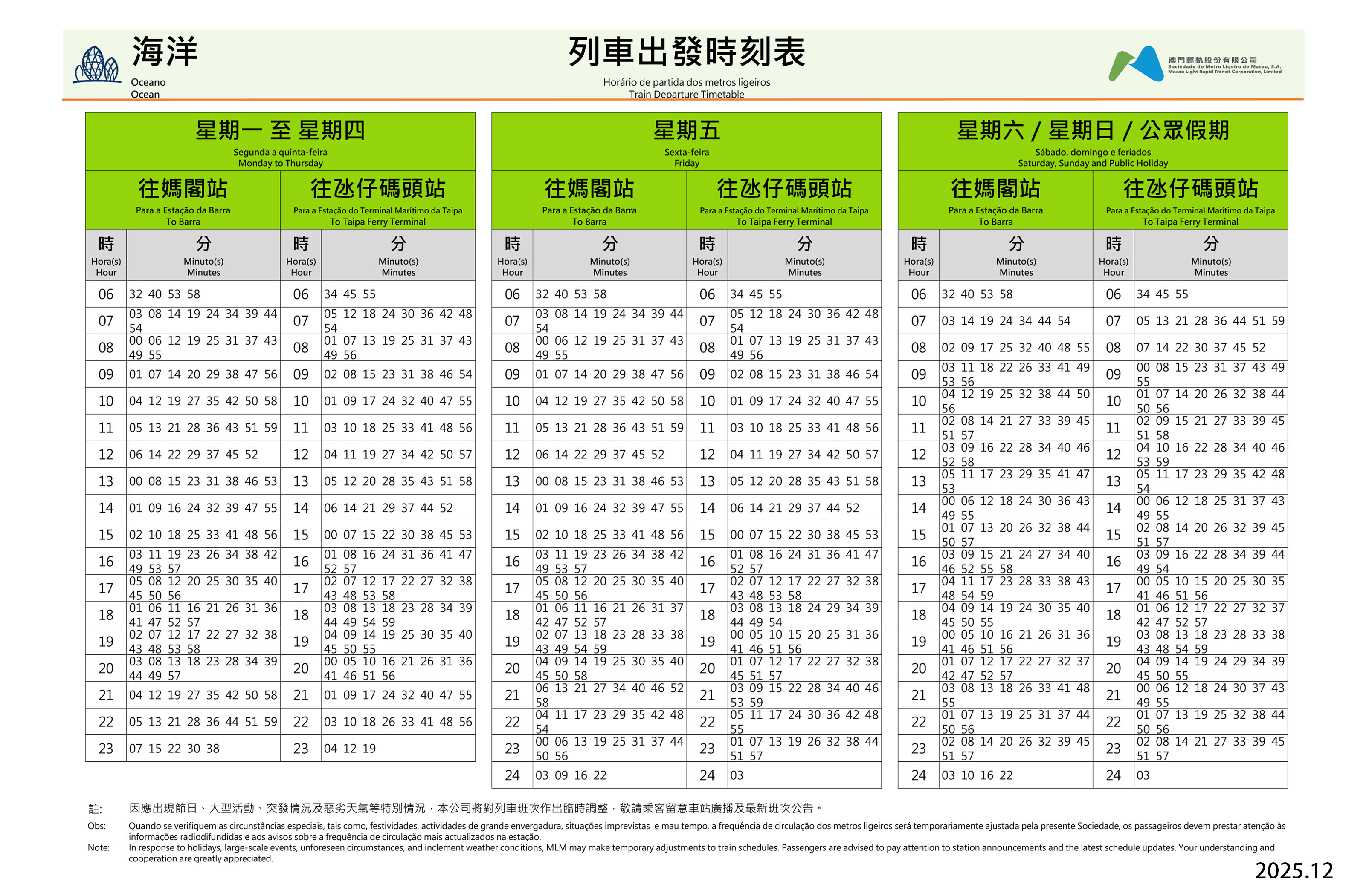 Ocean Station is located at the Avenida dos Jogos da Ásia Oriental, it is the only ground-level amount the stations of the Taipa Line and with an island platform design, to meet the needs of Taipa Line extension to the Barra Station through the lower deck of the Sai Van Bridge. The station's footbridge connects both the adjacent area and the Taipa Waterfront Recreation Area. This is not only eases the public in using the LRT, but also provides greater convenience in using the Recreation Area and enhances the quality of the residents living environment.
