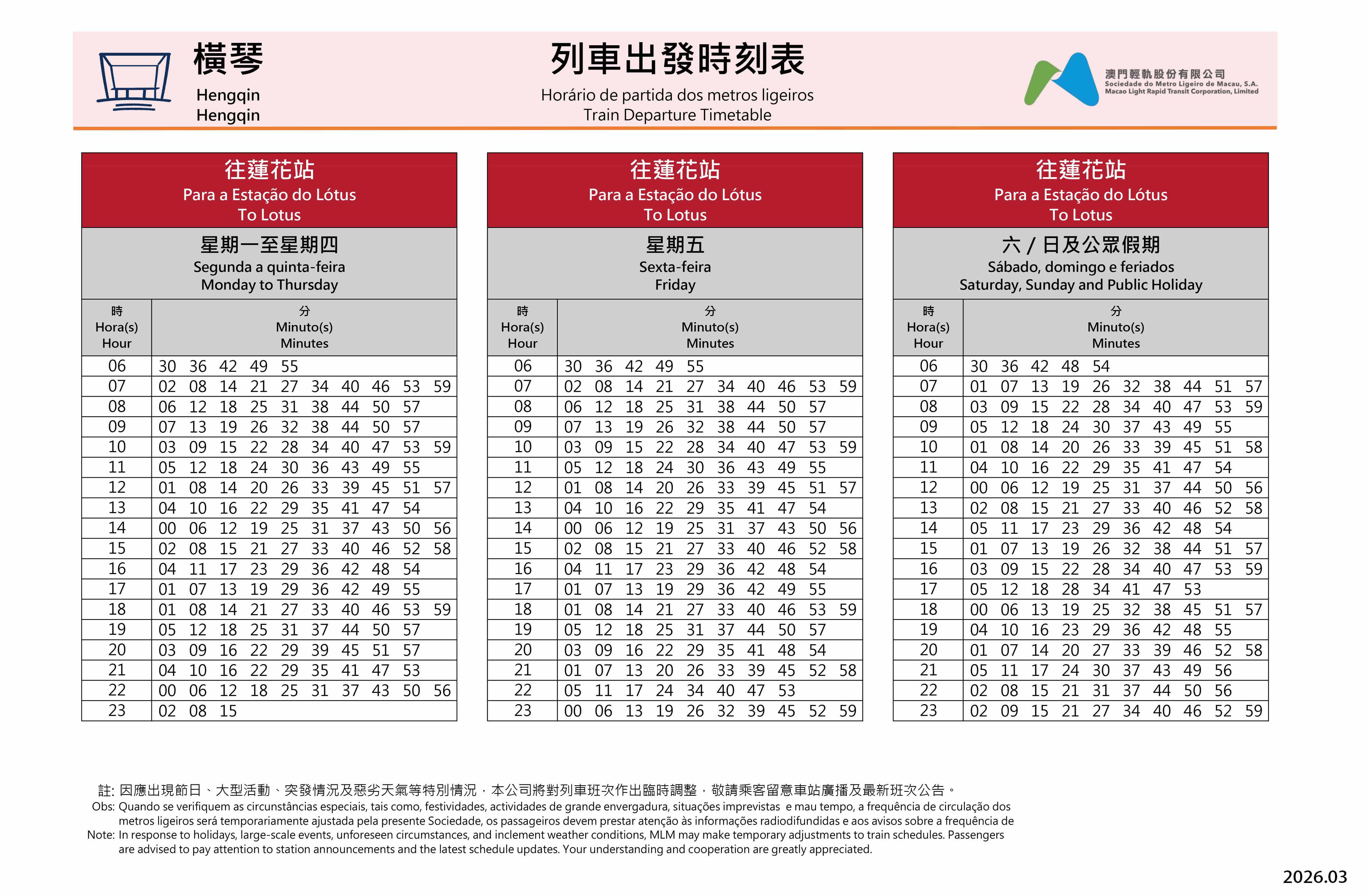 The “Hengqin Station” is located at the underground of the Macao Port Zone of Hengqin Port, passengers can easily walk to the departure hall using the lift or escalator after exiting the station. While travelers arriving Macao via the customs can also choose to take the Macao Light Rail “Hengqin Line”, then transfer to various parts of Macao by taking the “Taipa Line” or “Seac Pai Van Line, to facilitate citizens and travelers entering or leaving the Hengqin Port.