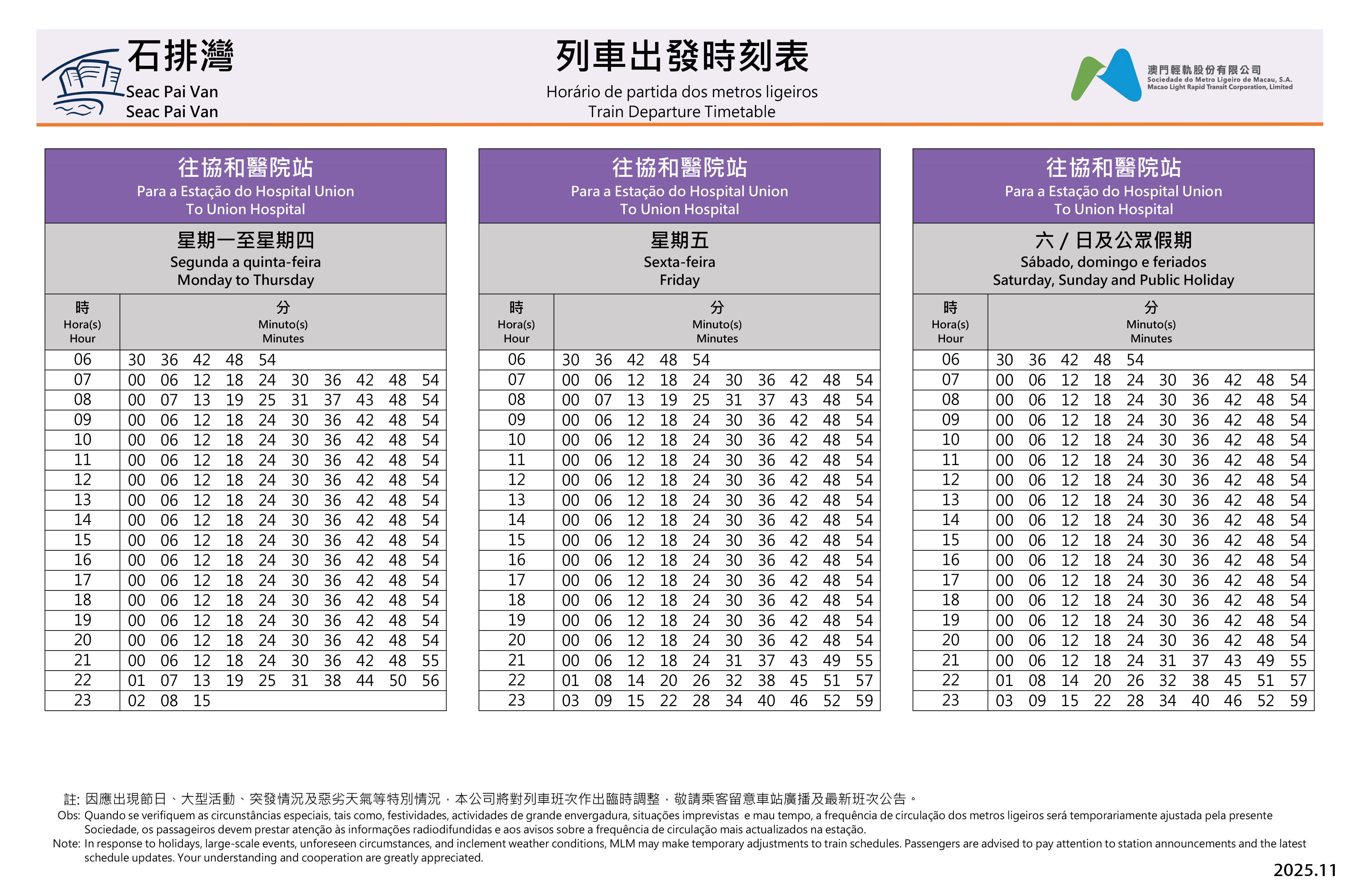 Seac Pai Van Station is situated on Estrada de Seac Pai Van, providing a seamless connection to a pedestrian bridge within the Public Housing area, facilitating convenient travel for residents and travelers from both the Seac Pai Van community and Coloane.