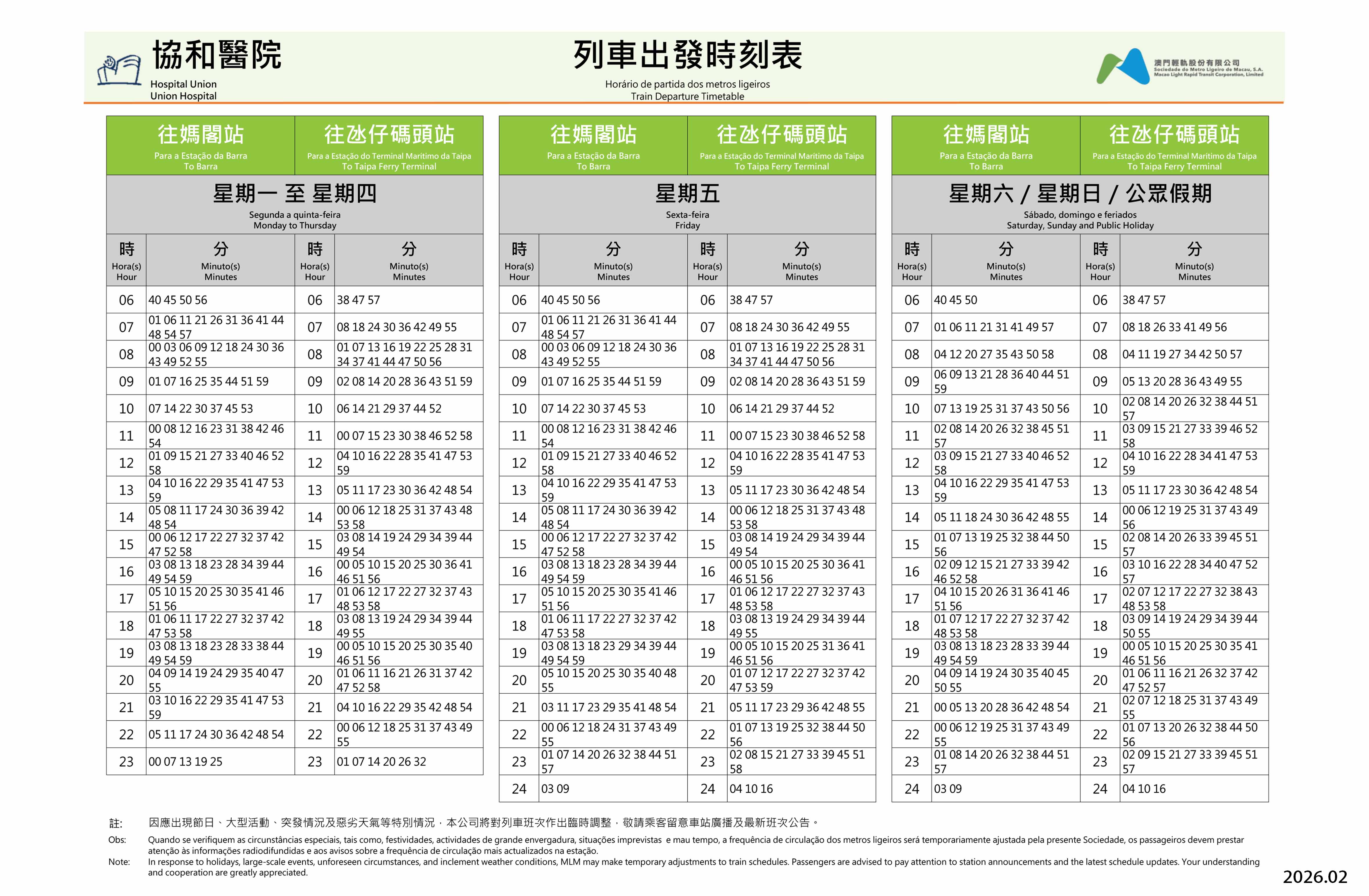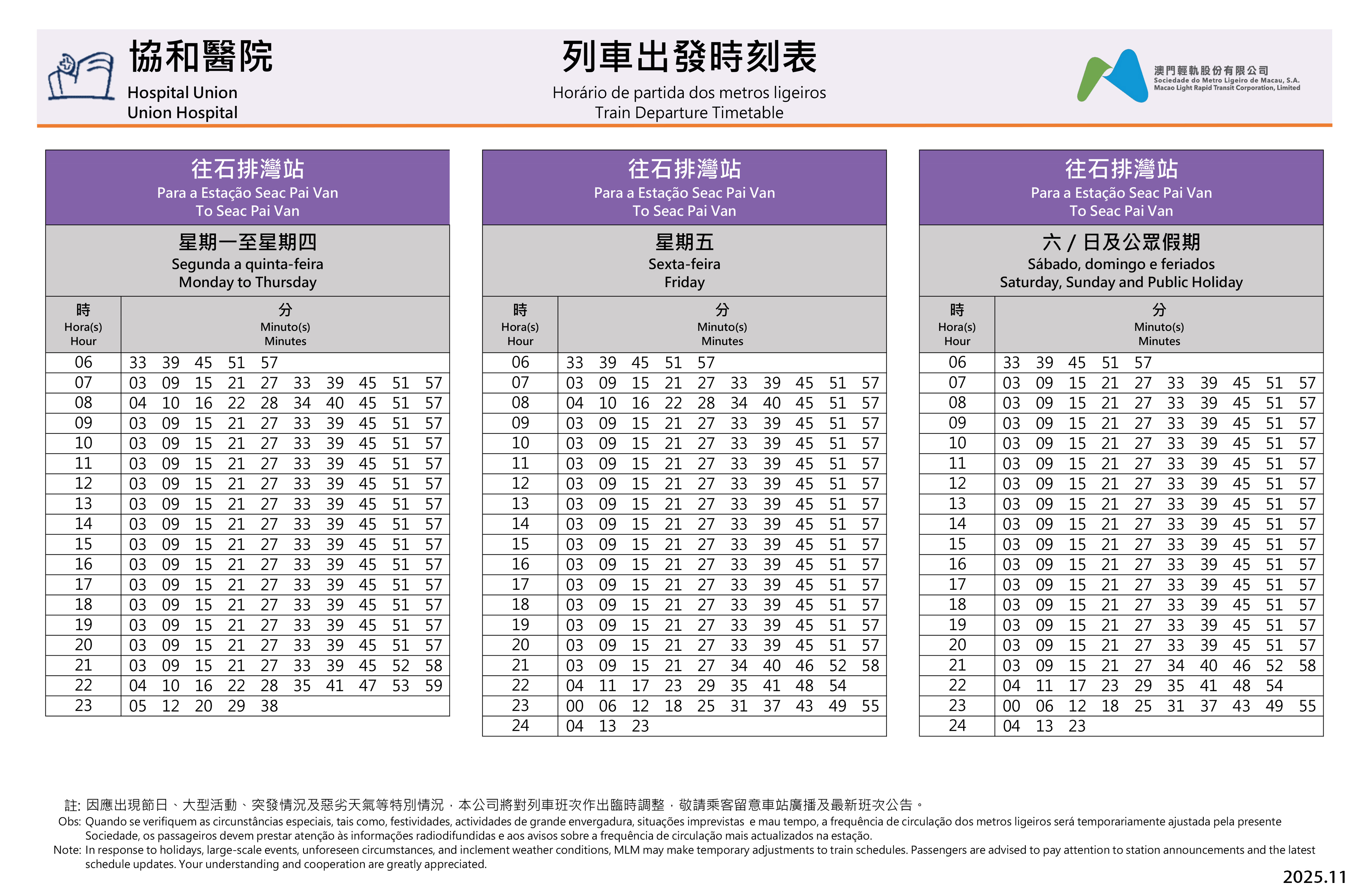 The Union Hospital Station, located on Estrada do Istmo, is connected to the entrance of the Islands Healthcare Complex—Macao Medical Center of Peking Union Medical College Hospital via a pedestrian bridge. At the station, passengers can also transfer to the Taipa Line.