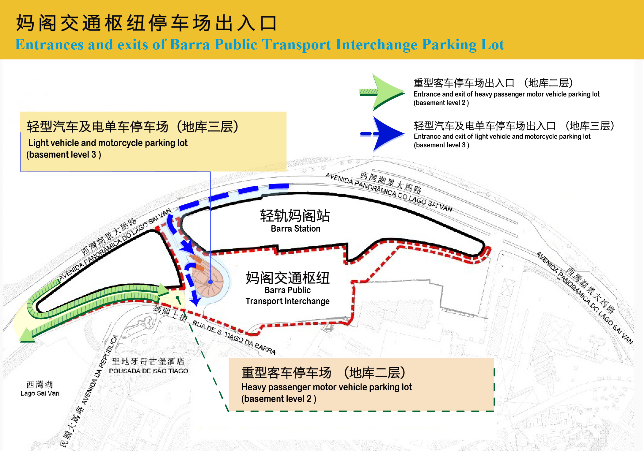 位於妈阁交通枢纽地库二层的重型客车停车场提供共27个重型客车泊位及6个临时上落客车位,出入口与巴士驶入交通枢纽的位置相同,驾驶者可沿西湾湖景大马路行驶西湾方向并按指示经分岔路进入停车场。