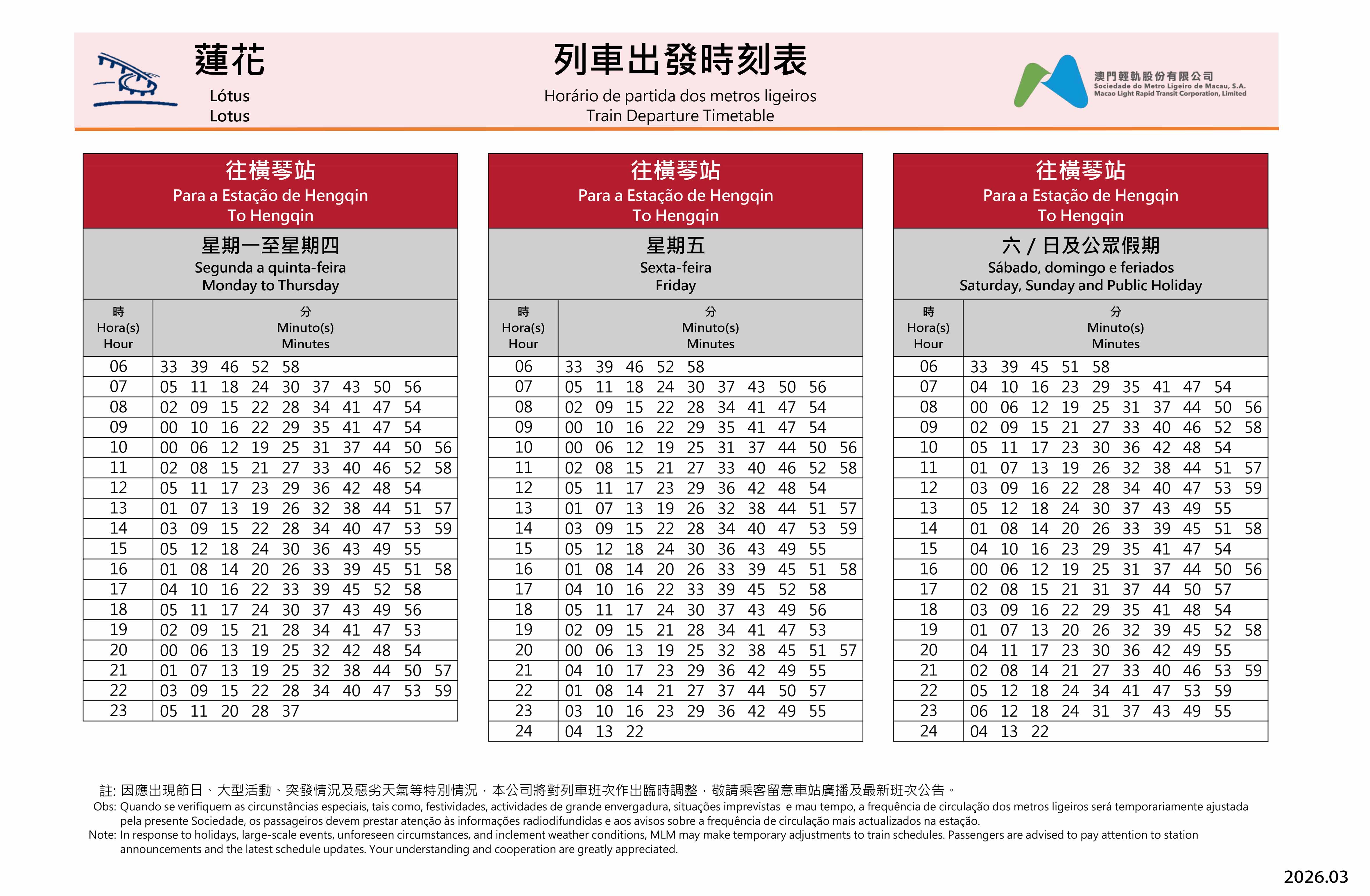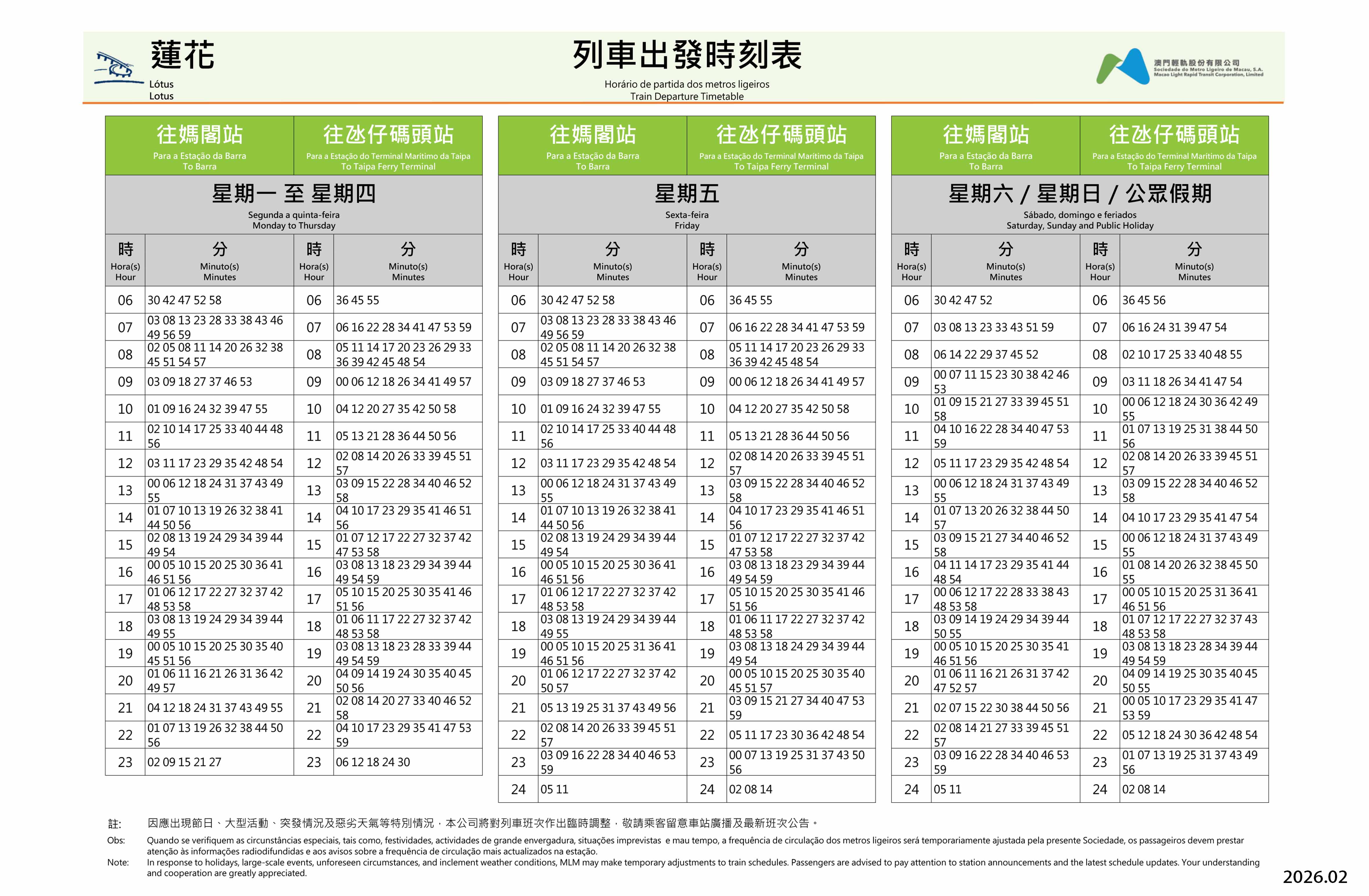 往妈阁站/氹仔码头站 - 列车出发时间表